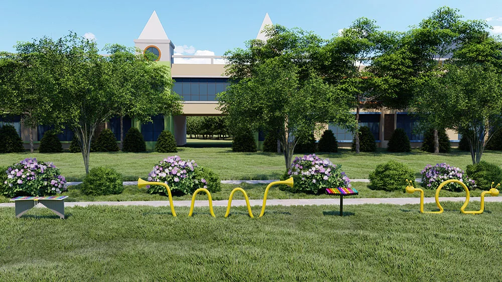 Шӯрои девори мусиқӣ бо асбобҳои сабукрав маҳсулоти классикӣ аз ҷониби Hank аст. Ин комилан зард аст, бо ду қубурҳои ороиши зард барои кӯдакон барои бозӣ бо озодона.